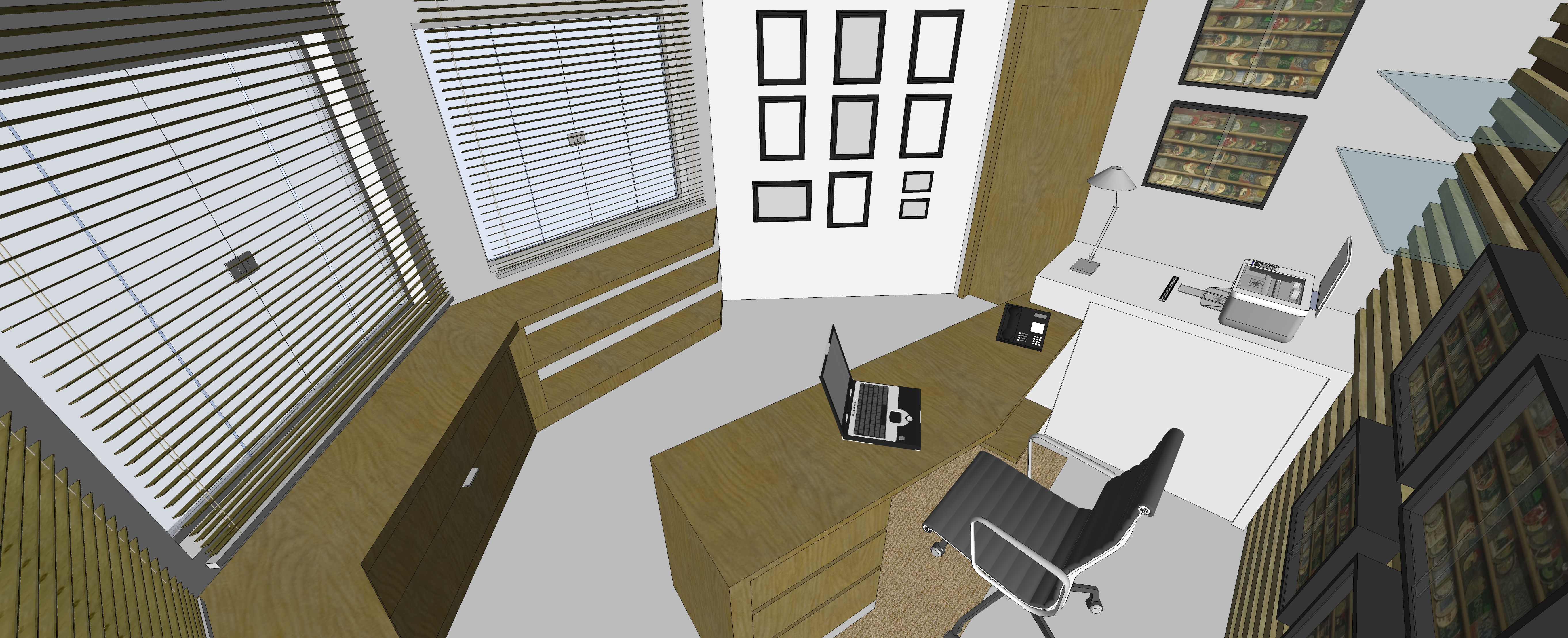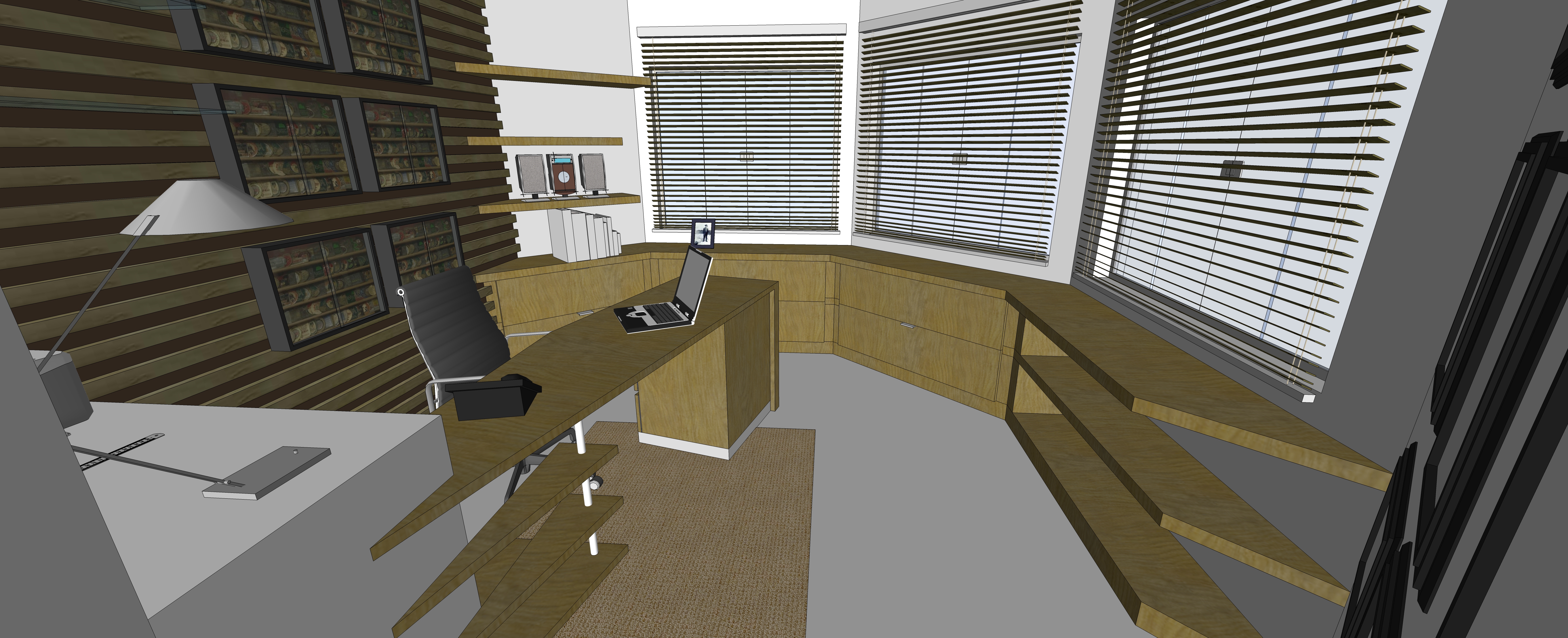 Este projeto foi feito para um cliente que construiu sua casa e precisava de um escritório bem elaborado que possibilitasse um grande aproveitamento do espaço irregular que ele dispunha. Trata se de um projeto antigo, de 2010, mas que tem linhas muito interessantes!