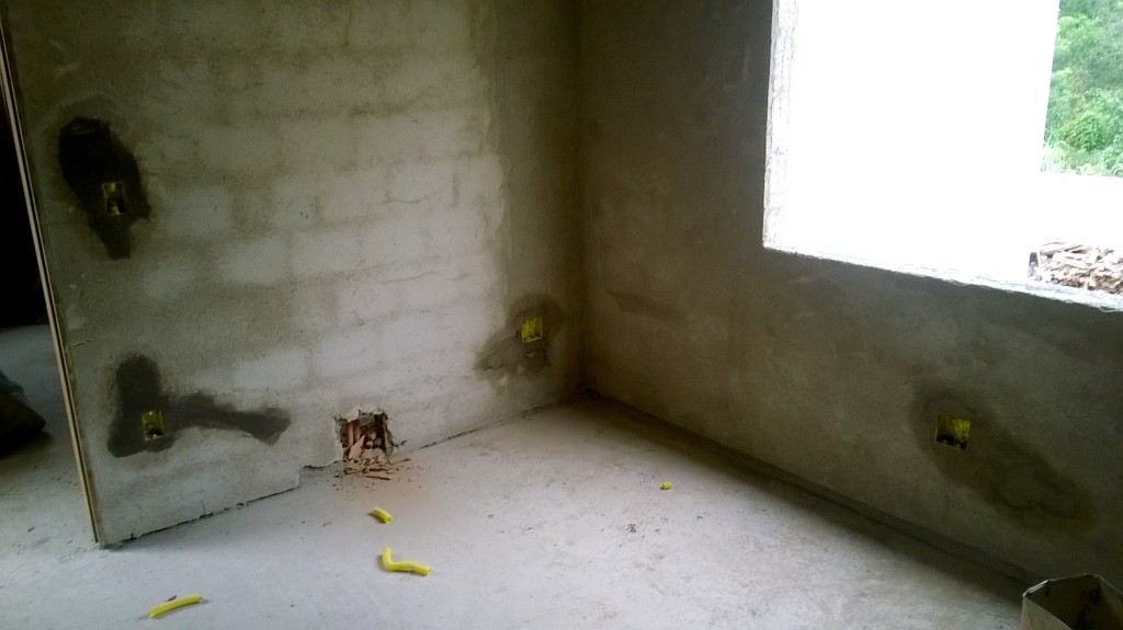 Nas paredes, os canos de descida de água pluvial que não foram previstos internamente nas paredes, podem ser cobridos e escondidos. No caso em questão, foram executados falsos shafts nos banheiros (falsos porque se tratou apenas de uma parede paralela a já existente cobrindo os canos de água) e nos quartos o revestimento das tubulações deu a impressão de elemento estrutural. A tubulação hidrossanitária principal foi executada anteriormente, como pode ser conferido no texto etapas da obra #19.