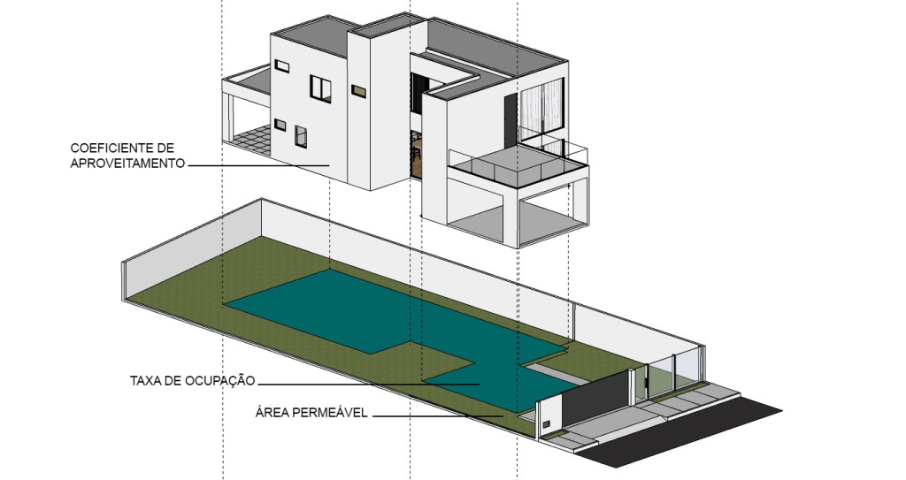 Índices construtivos – Os índices construtivos são números que definem as regras de aproveitamento de um terreno: o quanto pode ser construído, o limite de área, a reserva verde/permeável que deve ser respeitada, a relação da construção com a cidade e o vizinho. Ou seja, determinam “como” algo pode ser construído num terreno traduzido em limites.