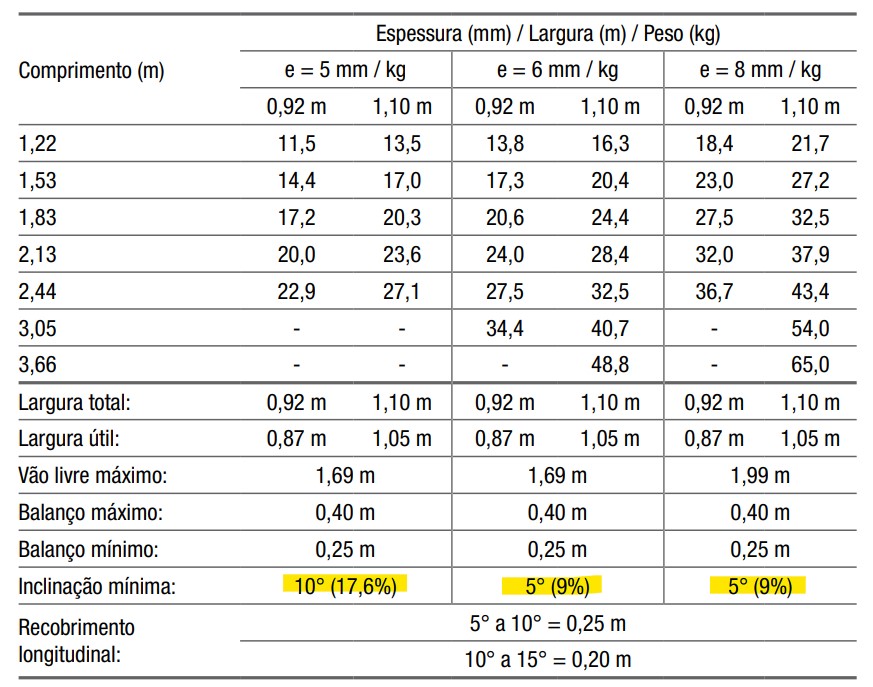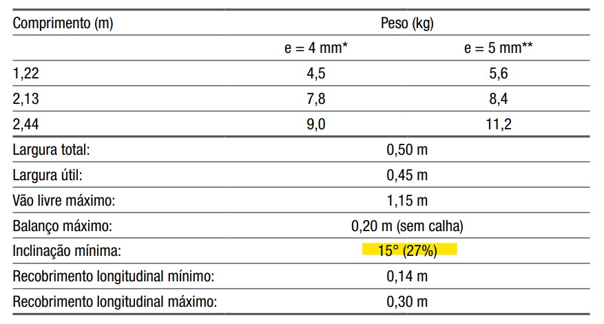 Vale ressaltar que é importante conferir a inclinação de instalação indicada pelo fabricante. Mesmo telhas do mesmo material podem ter inclinações diferentes. Em telhas de fibrocimento, por exemplo, é fácil encontrar variações de 9-27% entre fabricantes ou mesmo linhas da mesma marca.
